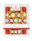 MANDELN 37 %, Zartbitter-Schokolade 22 %(Kakaomasse, Zucker, Kakaobutter, VOLLMILCHPULVER, Emulgator: Lecithine (SOJA), Vanille-Extrakt), Zucker, Vollmilch-Schokolade 6,7 %(Zucker, Kakaobutter, VOLLMILCHPULVER, Kakaomasse, Emulgator: Lecithine (SOJA), Vanille-Extrakt), Invertzuckersirup, Alkohol, Zuckersirup, weiße Schokolade(Zucker, Kakaobutter, VOLLMILCHPULVER, Emulgator: Lecithine (SOJA), Vanille-Extrakt), Orangenschalen, HASELNÜSSE, Haselnussgeist, EIERLIKÖR, natürliche Aromen, Glukosesirup, Kirschpüree, SAHNE, Birnensaftkonzentrat, Rum, Glukose-Fruktose-Sirup, Pflaumenpüree, Kirschsaft, Fruchtpulver Orange(Maltodextrin, Orangen, natürliches Orangenaroma), Gin, Birnenpüreekonzentrat, Williams-Birnenbrand, löslicher Kaffee, Fruktosesirup, Pflaumensaft, Säuerungsmittel (Zitronen-, L(+)-Weinsäure), getrocknete Zitronenzubereitung(Dextrose, Maltodextrin, Säuerungsmittel: Zitronensäure, Zitronensaftkonzentrat), stark entölter Kakao, MAGERMILCHPULVER, Geliermittel: Pektin, Feuchthaltemittel: Invertase, natürliches Kakaoaroma.