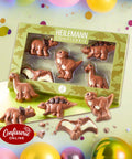 Aus zart schmelzender Vollmilch-Schokolade und dekoriert mit weißer und dunkler Schokolade, kommen die kleinen Urzeitwesen zum Anbeißen daher.